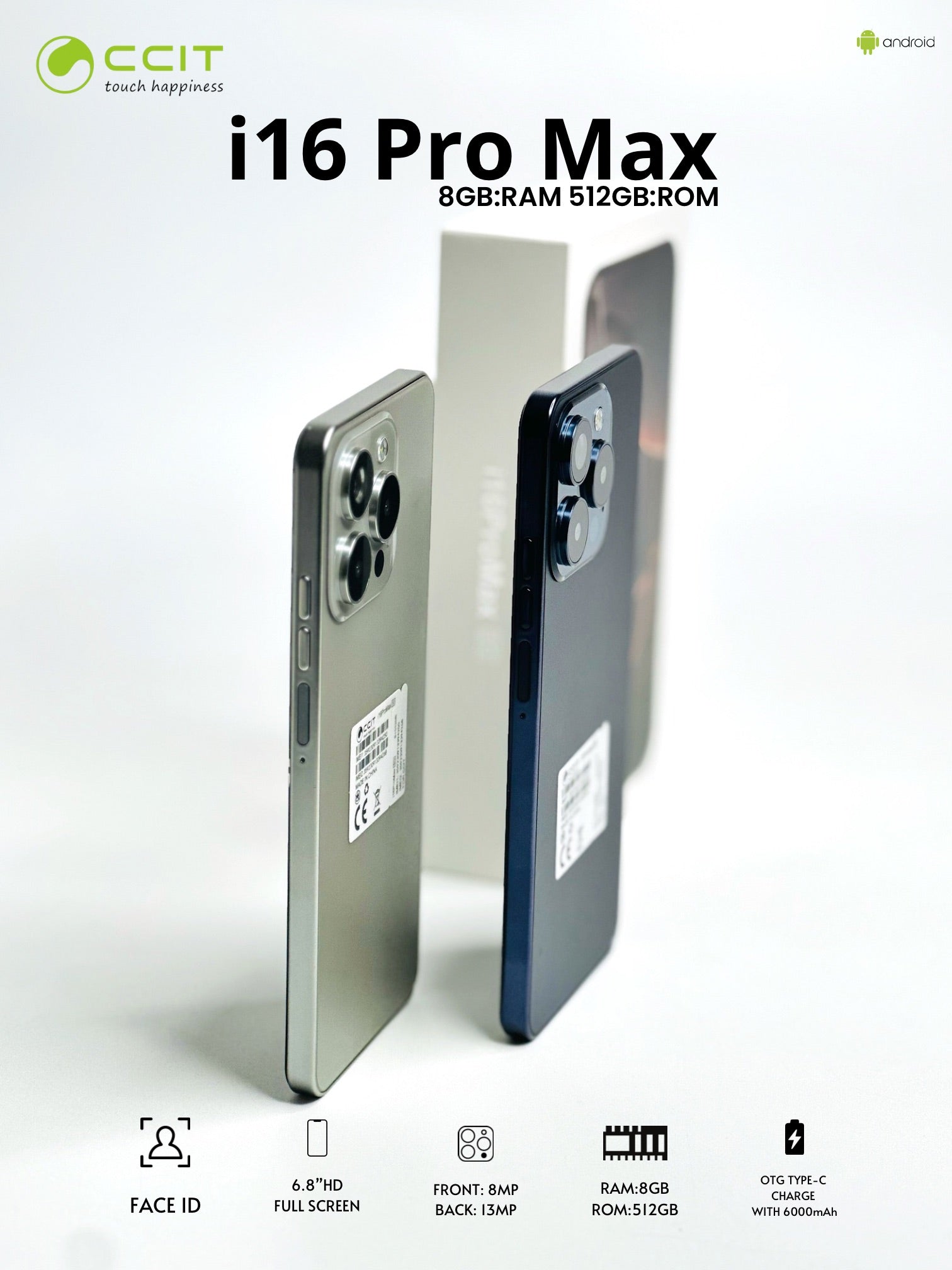 FACE ID SIDE FINGERPRINT 6.8"HD FRONT: 8MP RAM:16GB OTG TYPE-C CHARGE SENSOR UNLOCK FULL SCREEN BACK: 13MP ROM:512GB WITH 6000mAh