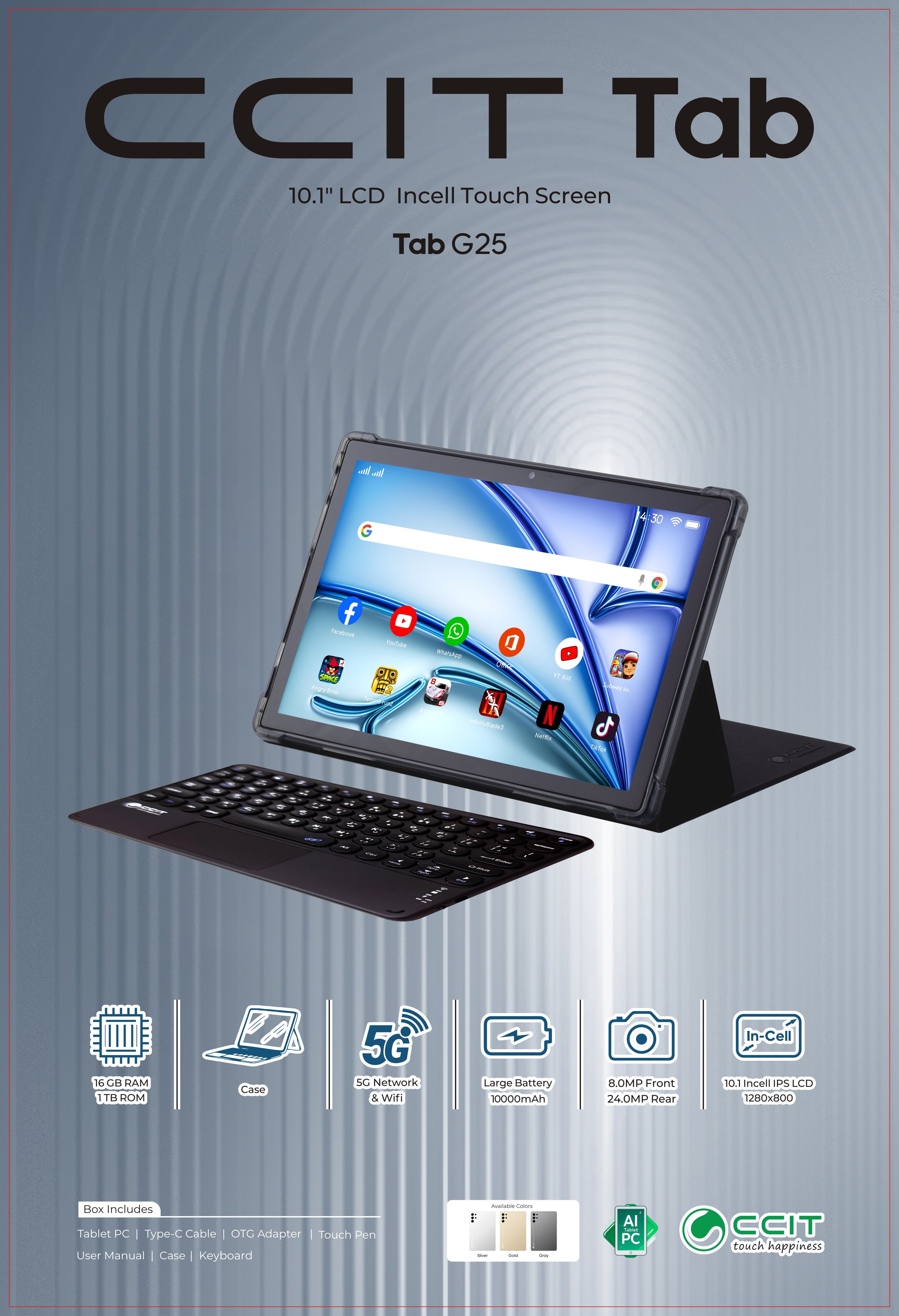 1 x Tab G25 Tablet 1 x Keyboard 1 x Stylus Pen 1 x Charging Cable 1 x Power Adapter