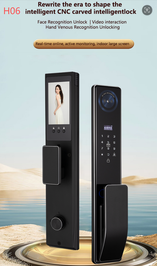 Product Parameters Eight ways to open a lock: Faces, palms, fingerprints, passwords,keys,cards, temporary,passwords,and remote lock-up Special lithium battery CO Face and paimrecognition HD display Operation display Welcome home. 2 Number keys unlock key 8 Card recognition is fast and without delay Lock key doorbell function One-touch locking from outside Quidkty open thehandle. Internal semiconductor fingerprint recognition Emergency power supply interface emergency mechanical key Reverse Lock Button